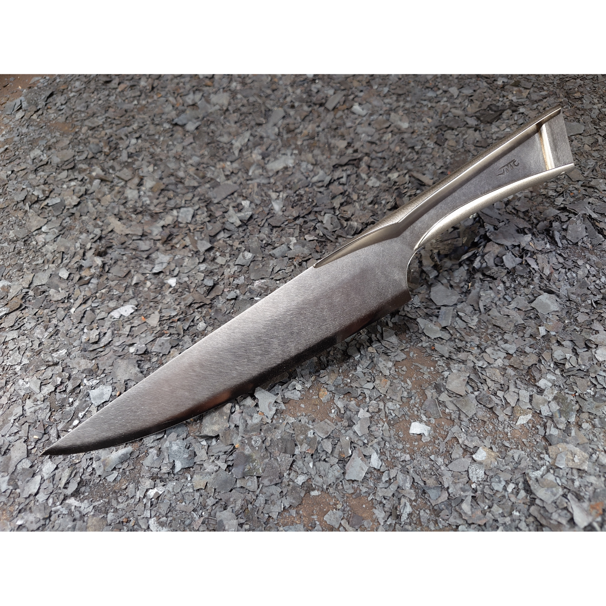 J’ai alors ma petite idée, que je lui expose. Le « Primitif » est un couteau à lame fine et large, dont le manche est très massif (l’outil accuse plus de 500gr). Pour gagner du poids, il faut concevoir ce manche différemment. Je proposai donc de composer le manche de « l’Évolutif » au moyen de 2 coques en inox fines, fixées sur la tranche de la plate-semelle. Cela évoque très clairement le manche forgé du « Primitif », et permet aisément l’allongement souhaité sur le dos de la lame. Il faudra un premier prototype pour confirmer l’ergonomie et le gain de poids.
