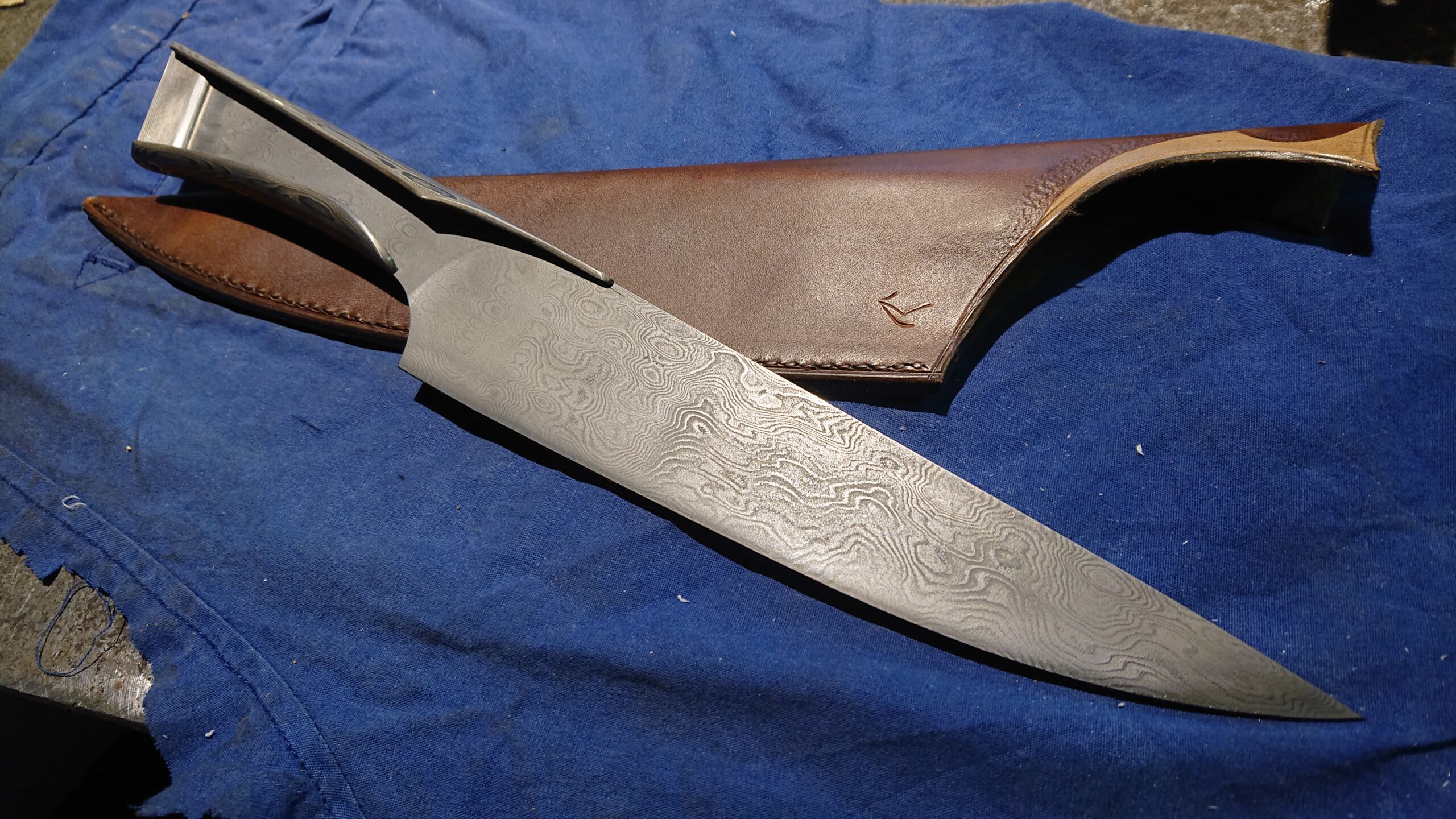 Je fabrique moi-même les aciers damassés que j’utilise, il m’arrive aussi de faire de l’acier Damassé-mosaïque. Ce dernier demande ingéniosité et labeur, car je travaille de manière classique et non par la métallurgie des poudres.